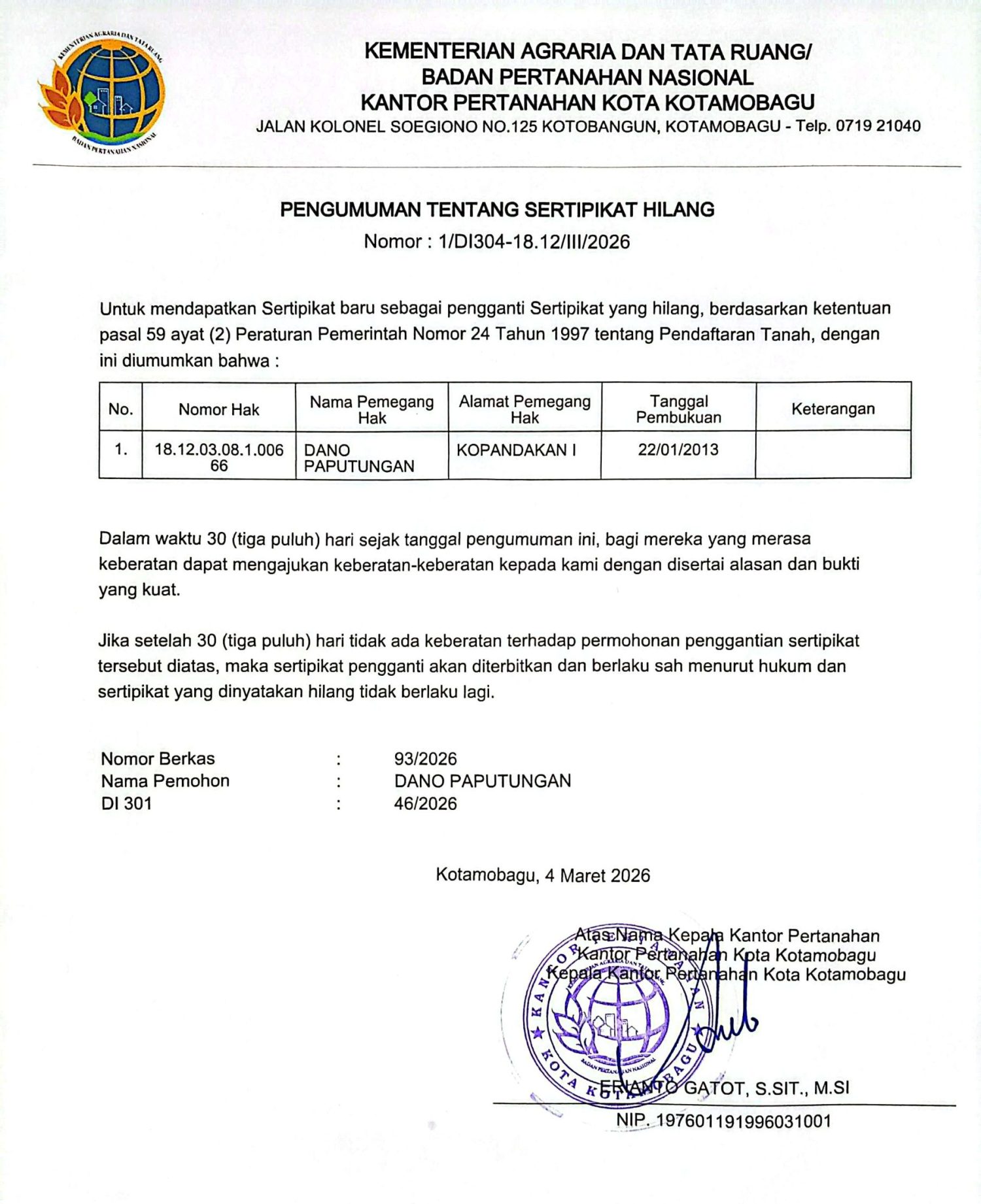 Pengumuman Tentang Sertipikat Hilang